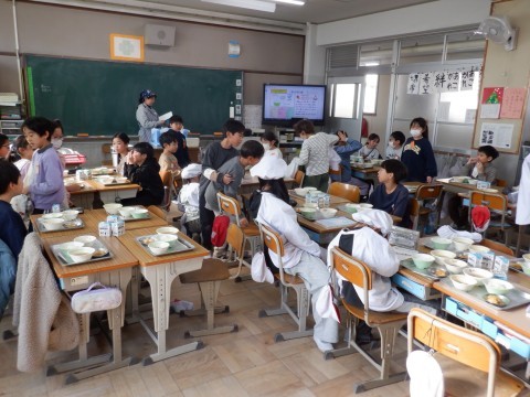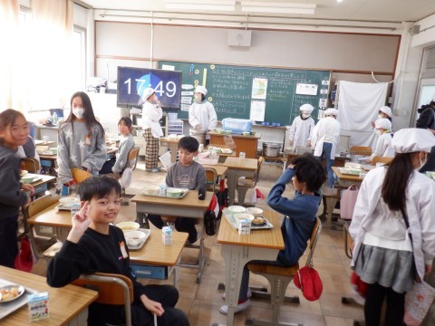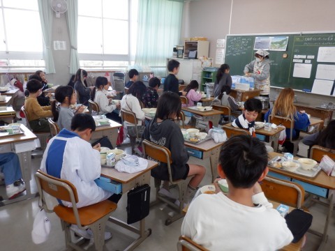 4年生は机をつけてグループで食べるクラスもあります。みんな楽しく給食を食べてください。