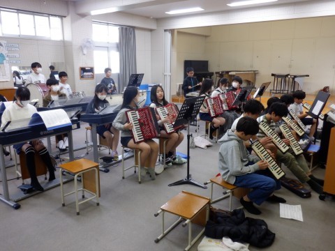 体育、音楽の授業です。音楽は合奏です。「ドラゴンクエスト」のテーマを練習しています。みんな自信をもって楽器を演奏しています。こちらも出来栄えが楽しみです。