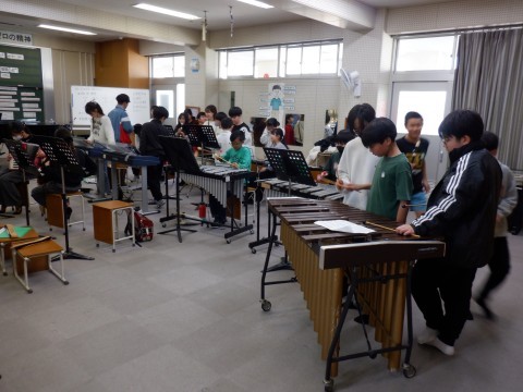 音楽、社会の授業です。音楽の授業は、「威風堂々」を合奏します。それぞれの楽器の練習です。簡単そうでなかなか難しいです。しっかり練習してください。