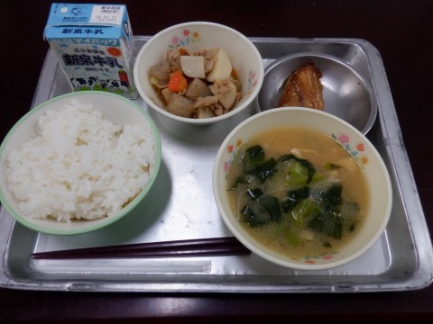 あじのみりん干し、いも煮、みそ汁、ごはん、牛乳です。今日は和風のメニューです。寒い日にはいも煮やみそ汁のような温かいメニューがありがたいです。