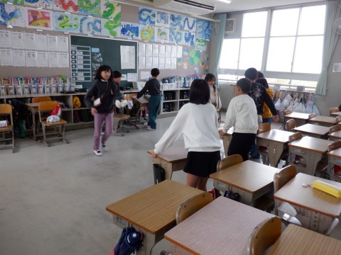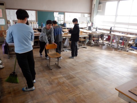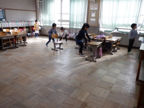各クラス協力してそうじをしています。机を動かしてごみをはいた後、ぞうきんで拭いています。掃除当番にみなさんご苦労様です。