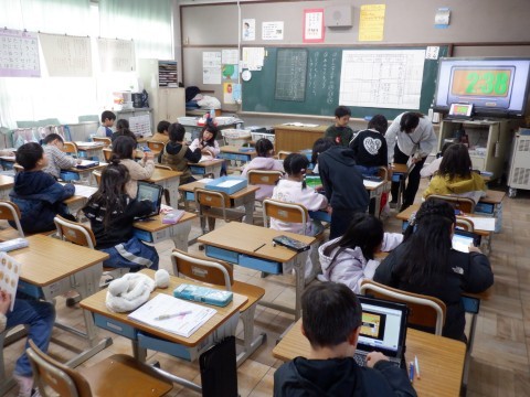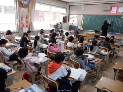 全クラス国語の授業です。児童が朗読をしています。大きな声でみんなに聞こえるように読んでいます。簡単そうでけっこう難しいです。落ち着いて読んでください。