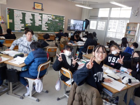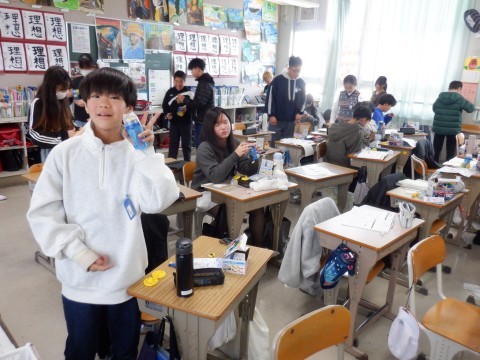 理科、社会の授業です。理科の授業は、発電や省エネについて学んでいます。まずは手回しで発電する器具を使って発電の大変さを体験しました。大事な単元ですしっかり学習してください。