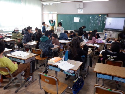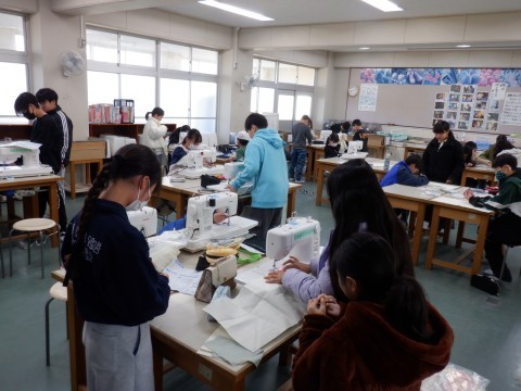 家庭科、国語の授業です。国語の授業は、「想像力のスイッチを入れよう」を学習しています。スイッチが入るにはどう書かれているでしょうか。実体験も大事ですが、どう読み取るかも大事です。しっかり頑張りましょう。