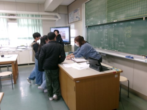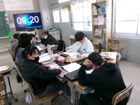 家庭科と国語の様子です。家庭科では,奉仕活動の一環として雑巾作りや大型テレビのカバー作りについて話し合いをおこなっていました。