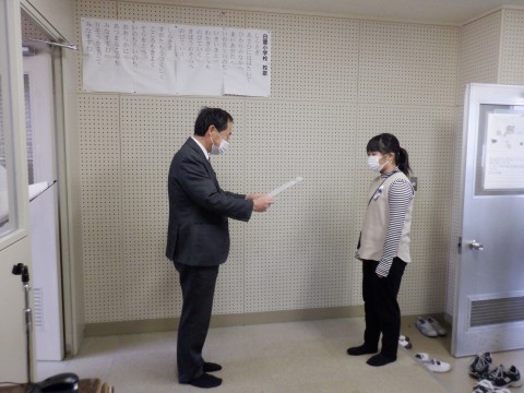 校歌を歌った後、朝のあいさつと校長先生からお話がありました。目標を持って楽しく頑張りましょうというお話でした。子ども市展の入賞者の表彰がありました。よく頑張りました。最後にデジタルアートグランプリ、My漢字の連絡がありました。たくさんの児童からの応募を待っています。