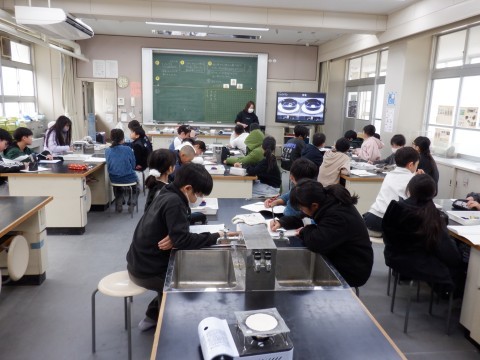 国語、理科の授業です。理科の授業は水に溶けているものの実験です。水を蒸発させたらとけているものは出てくるでしょうか。楽しみですね。でも、火を使うので気をつけて実験してください。
