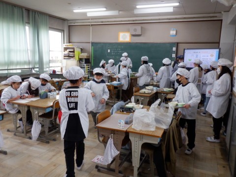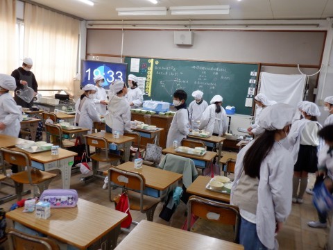 どのクラスもみんなで協力しながら準備を進めています。準備をした後は、みんなで楽しい給食です。しっかりいただいてください。