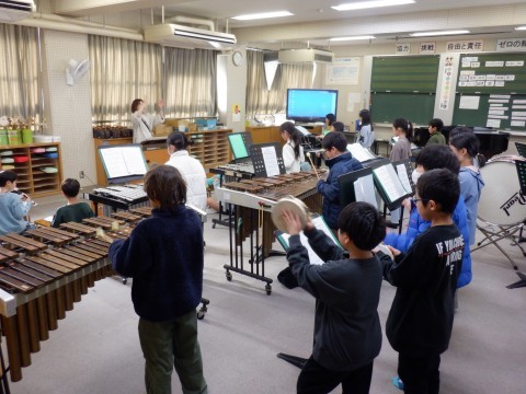 国語、体育、音楽の授業です。音楽の授業は、みんなで合奏に取り組んでいます。「鉄腕アトム」を練習しています。リコーダー、けん盤ハーモニカだけでなく鉄琴やドラムなども合奏には使います。みんな頑張って練習してください。