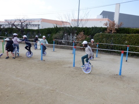 今日も朝から晴天です。多くの児童がグラウンドに出て遊んでいます。ドッジボール、サッカーをしている児童、一輪車や遊具で遊んでいる児童もいます。なわとびも盛んです。先週から使えるようになったフラフープも人気です。みんな元気に遊んでいます。
