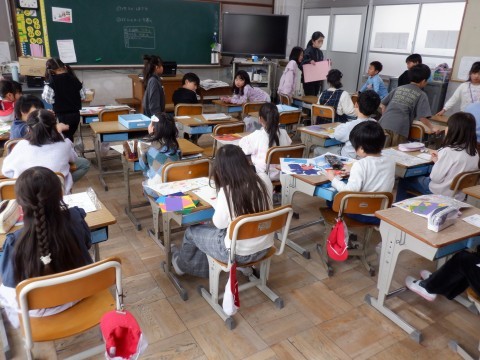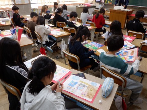全クラス図工の時間です。色版画に取り組んでいます。専用の色紙を切って下絵に貼り付けた後、水で湿らせると色版画ができます。雰囲気のあるいい作品ができます。頑張ってください。