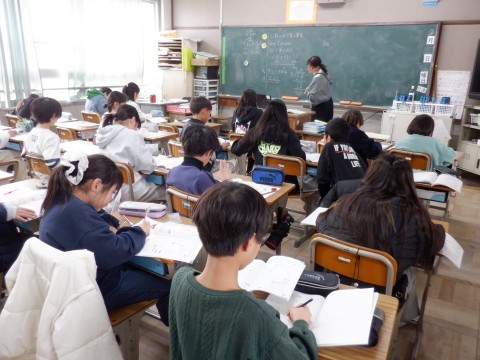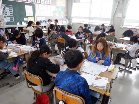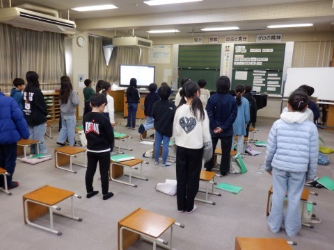 算数、音楽、算数の授業です。音楽の授業は校歌チャレンジです。校歌を間違ったら座っていきます。何人の児童が残れるかな。しっかり覚えてください。