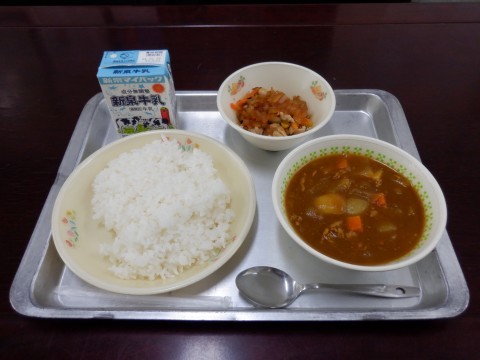ポークカレーライス、豆とひじきのサラダ、和からしドレッシング、ごはん、牛乳です。今日はポークカレーライスです。みんなが大好きなメニューです。