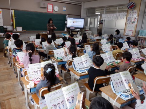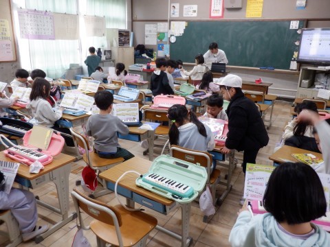 音楽、算数の授業です。音楽の授業では、けん盤ハーモニカを使って演奏もしますが、タンブリンやトライアングルを使ってリズムをとる練習もしました。曲に合わせて打つところがわかっていても思うように打てないこともよくあります。リズム感覚をしっかり養ってください。