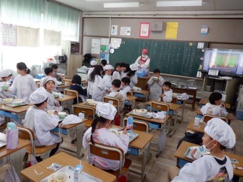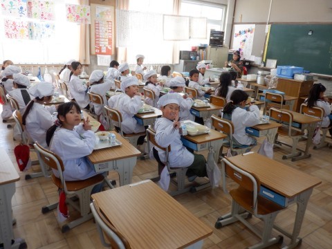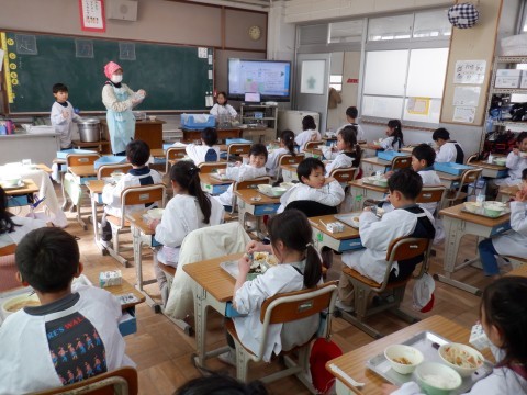 今日は準備がすでに整って、全部のクラスで「いただきます」をしました。みんなで楽しく給食をいただいています。温かいはりはりうどんはやさしい味で、しっかり食べていました。