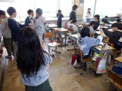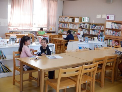 図書、理科の授業です。理科の授業は、音の伝わり方を学習しました。糸電話を使って声がちゃんと届くか実験しました。糸の様子で伝わり方が変わるようです。確かめられたかな。