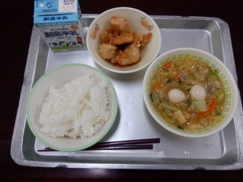 八宝菜、油淋鶏、ごはん、牛乳です。今日は中華メニューです。子どもたちも大好きなメニューです。しっかり食べていました。いつもおいしい給食をありがとうございます。