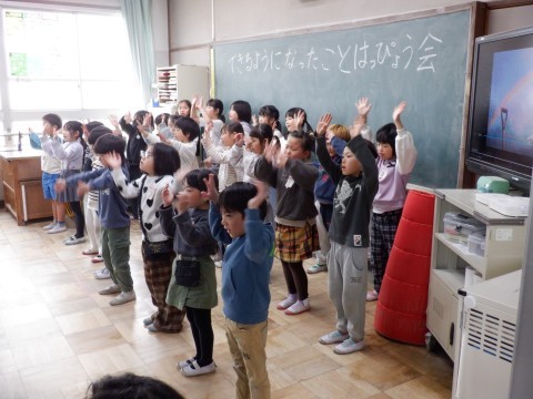 できることになったことはっぴょう会を行いました。各クラスで合唱、詩の朗読、フラフープ、なわとび、マット運動、けん盤ハーモニカ、九九、劇など発表しました。みんな一生懸命に発表する姿は、今しかない最上の輝きを放っていました。みんなご苦労様でした。