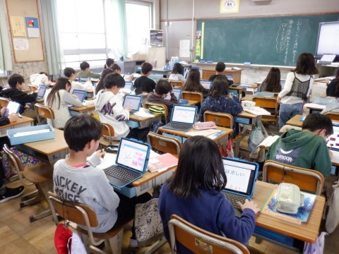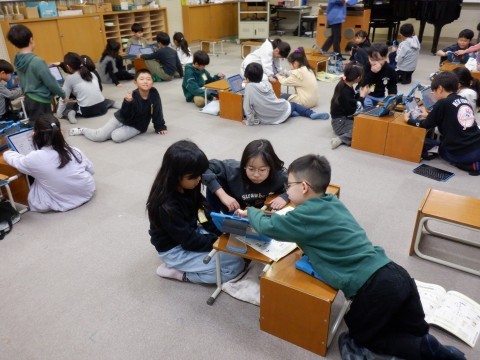 音楽、国語の授業です。音楽の授業は、クロックミュージックを学習しました。各自の端末で音源を聞いて、どんな音なのか、特徴は、使い方など考えました。みんなしっかりと取り組んでいます。