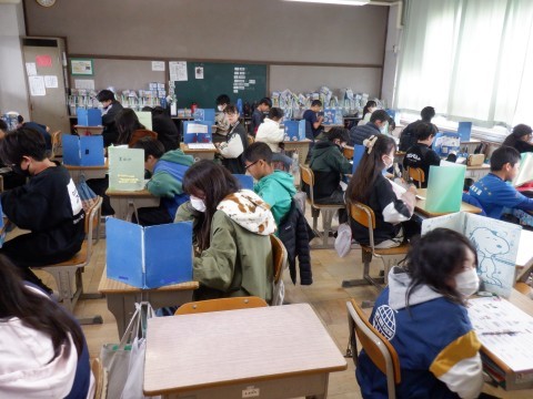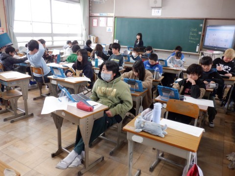 外国語、国語の授業です。国語の授業では、発表をわかりやすくするにはどうすればよいか考えました。実際に発表してみてうまく伝わったか調べてみます。どうすればうまく伝わるでしょうか。難しい問題ですね。