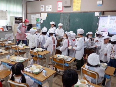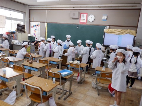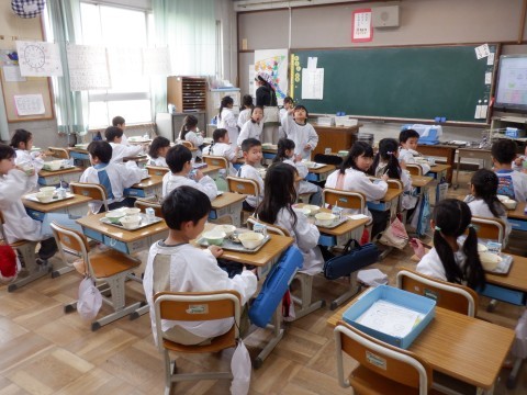 この時期は1年生も準備がすごく手際よくなってきています。みんな協力的に動いています。すでに「いただきます。」をしたクラスもありました。楽しい給食時間を過ごしてください。