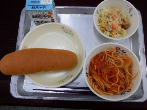スパゲッティのトマト煮、ホットサラダ、マヨごまドレッシング、ミニコッペパン、牛乳です。トマト風味のスパゲッティは子どもたちの大好きなメニューです。しっかりと食べていました。