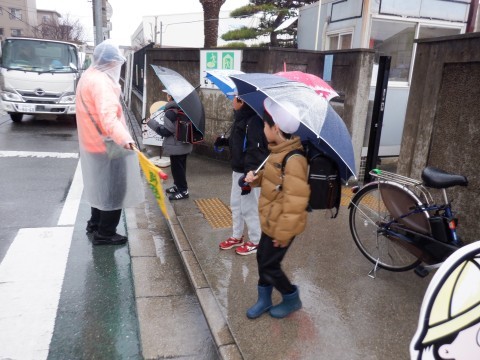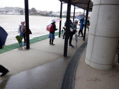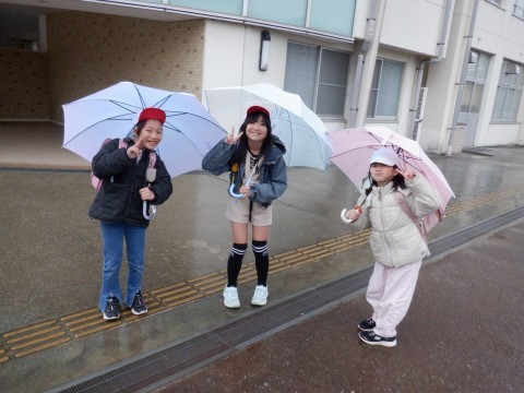 昼間は雨がやんでいましたが、下校時になって降ってきました。傘をさしての下校です。雨の日はまわりが見にくくなる時もあるので、気をつけて下校してください。明日も元気に登校しましょう。