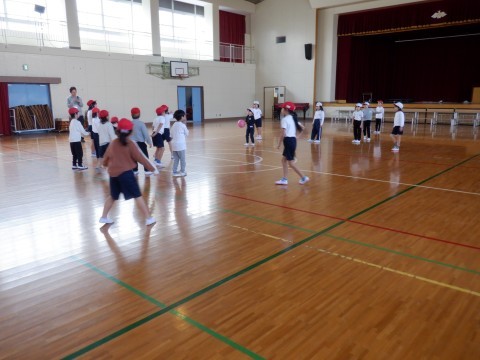 体育、算数の授業です。体育の授業は、体育館でドッジボールをしています。やわらかいボールを使っています。少し大きいのでスピードが上がらない分、逃げやすくなっています。みんな頑張れ!