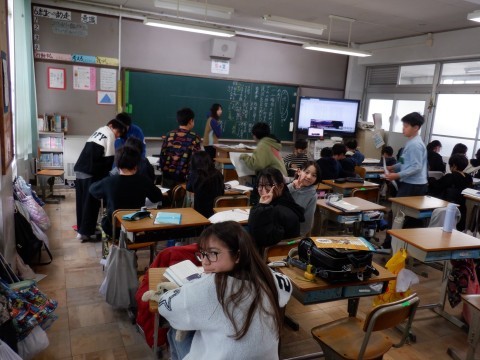 外国語、国語の授業です。外国語の授業は、「ケフート」というクイズをこれからします。NSの先生からの問題です。しっかり聞き取れるでしょうか。頑張ってください。