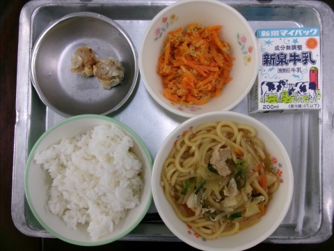 今日の給食は,ごはん・牛乳・みそラーメン・やきシューマイ・にんじんしりしりでした。「しりしり」という言葉は千切りという意味の沖縄県の方言です。今日も,おいしくいただきました。ごちそうさまでした。