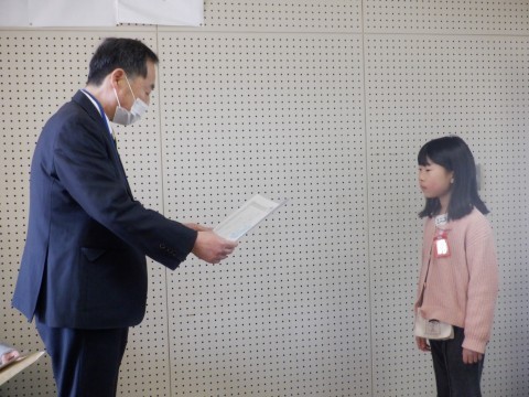 校歌、あいさつの後、校長先生からお話がありました。世界に目を向けて自分に自信をもって進もうというお話でした。表彰がありました。教育委員会表彰、堺っ子書道展、小学生絵画コンクール、今年の漢字です。みんな本当によく頑張ってくれました。最後に今年の漢字を選ばれた児童の作文の読んでもらいました。漢字を選んだ経験や思いがしっかりと伝わりました。今回の朝礼は少し長くなりましたが、最後まで集中して聞けていました。よく頑張りました。