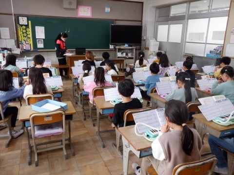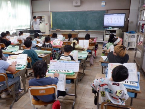 全クラス音楽の授業です。トンボの眼鏡やギンギンギラギラなどよく知られている歌を歌ったり、けん盤ハーモニカで演奏したりみんなで音を楽しんでいます。みんな積極的に頑張っています。