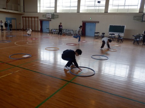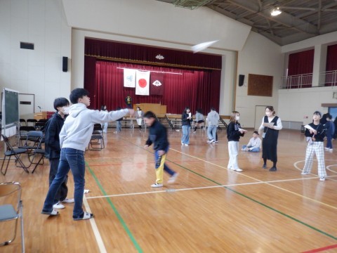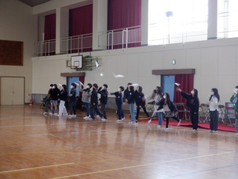 体育館で合同で特活です。みんなでゲームなどをして卒業の前のひと時、楽しい時間を過ごしました。紙ヒコーキを飛ばしたり、陣取りゲームで遊んだり今しかできない時間の過ごし方をしました。