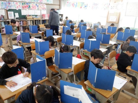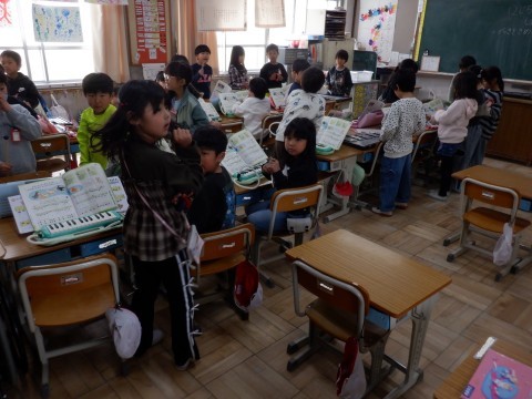 音楽、体育、算数の授業です。音楽の授業は、グループで合奏をしています。みんなで協力して音楽を演奏するのはとても楽しいですね。頑張ってください。