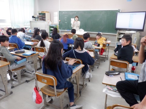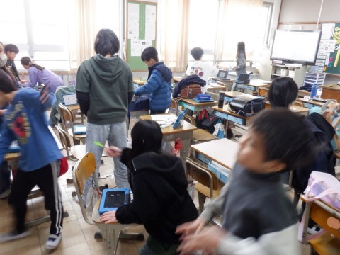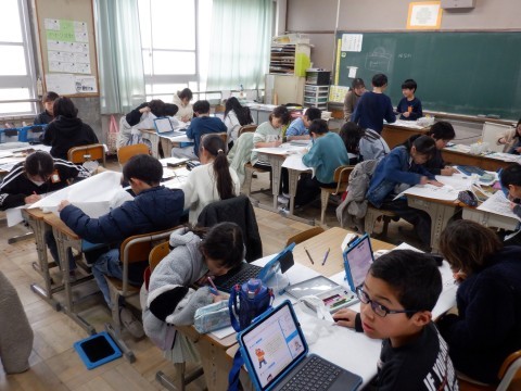 図工の時間です。もちかえり袋に絵を描きました。自分の考えた絵を描いていきます。色使いも様々です。楽しい袋ができそうです。