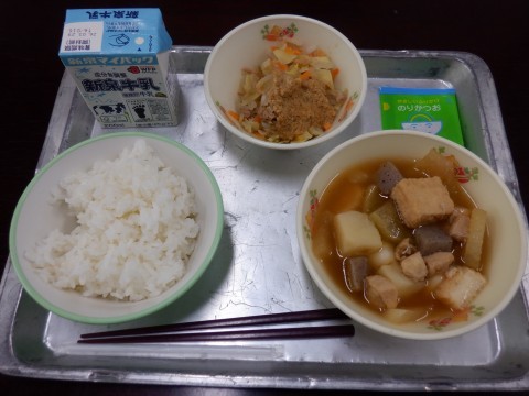 おでん、野菜のごま酢、ごま酢だれ、ふりかけ、ごはん、牛乳です。おでんは暖かくてやさしい味で子どもたちには好評でした。