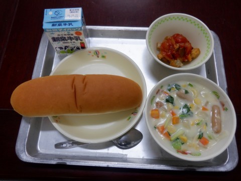 たらのナポリタン風、クリーム煮、コッペパン、牛乳です。コッペパンにクリーム煮はとてもよく合います。しっかりと食べていました。