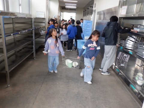 給食係さんが給食場に返却に来ています。今日もご苦労様でした。係のみなさんのおかげで給食の時間がスムーズに進んでいます。来年もよろしくお願いします。