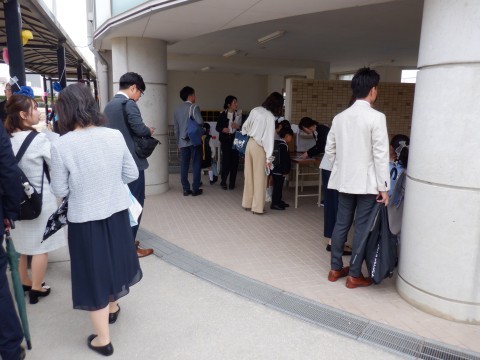 登校してきた児童、保護者が受付をしています。この後、新1年生は教室で準備をし、保護者は体育館で開始時間まで待機です。