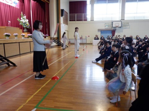 担任の先生の発表です。どんな先生かみんな興味津々です。