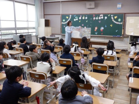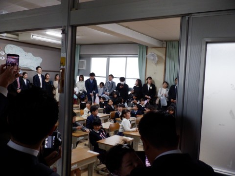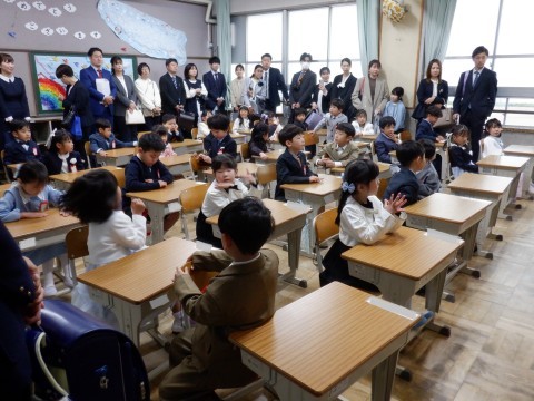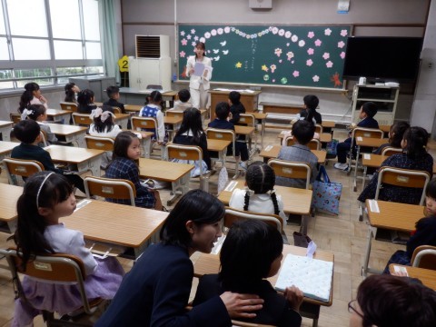 緊張した入学式が終わって教室に戻ってきました。早速、先生からのお話や絵本の読み聞かせなどがありました。子どもたちはリラックスしているようです。