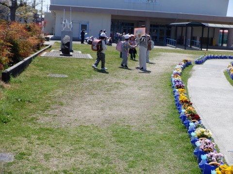 入学式の後、初めての下校です。今日は保護者と一緒ではなく子どもだけで帰ります。方面に分かれて家の近くまでは先生と一緒に帰ります。道を覚えるだけでなく、交通安全にも注意してください。明日も元気に登校しましょう。