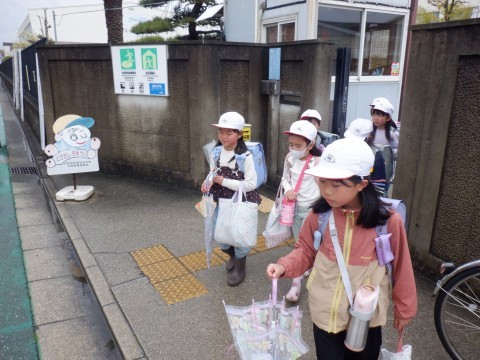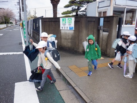 この時間は雨の止み間になりました。傘をささずに下校していきます。金曜日は荷物が多いですね。気をつけて帰ってください。来週は、給食、通常授業が始まります。来週も頑張りましょう。