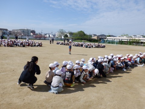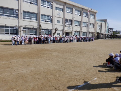 とても良い陽気の中、グラウンドで行われました。2~6年生が待つ中、1年生が1組から入場してきました。校長先生からのお話の後、児童会からの歓迎のことば、1年生全員からお礼のあいさつがありました。最後にみんなでじゃんけん大会をしました。