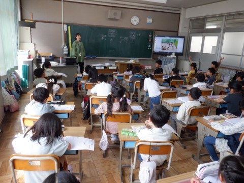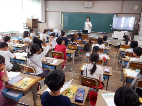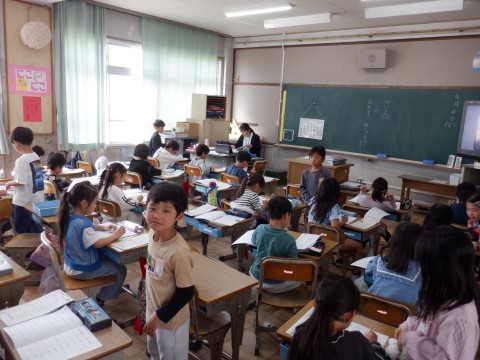国語、算数、国語の授業です。算数の授業は、たし算、ひき算の計算問題です。ドリルを使って問題を解いていきます。上手に計算できるかな。頑張ってください。