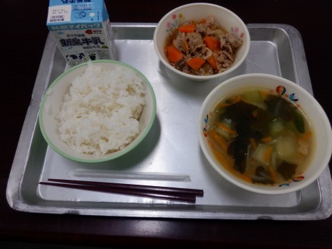 豚肉のプルコギ、トックとわかめのスープ、ごはん、牛乳です。きょうは韓国料理のメニューです。どちらも辛味はなく、どちらかというと甘めの味つけでした。子どもたちもしっかり食べていました。