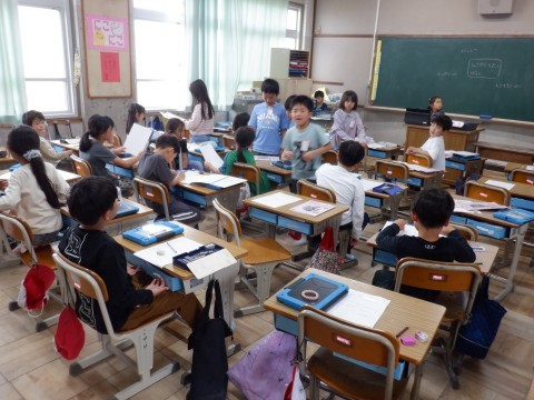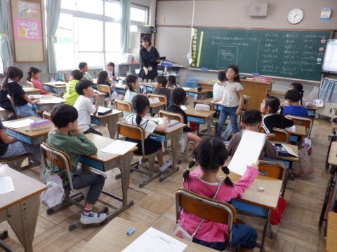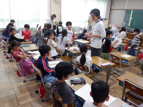 全クラス生活科の授業です。グループで学校探検の計画を立てています。「どこに行こうかな。」「あんなところもあるな。」「あそこは行けるのかな。」など話し合っています。楽しい授業ですね。