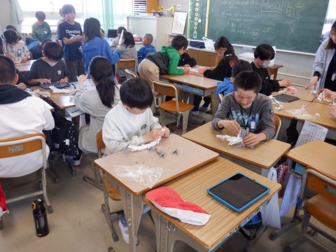 図工、外国語の授業です。図工は、洗濯ばさみアートです。洗濯ばさみを使って立体の作品を作っています。面白い作品ができているようです。