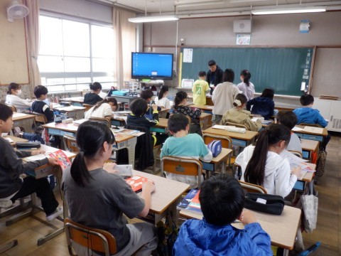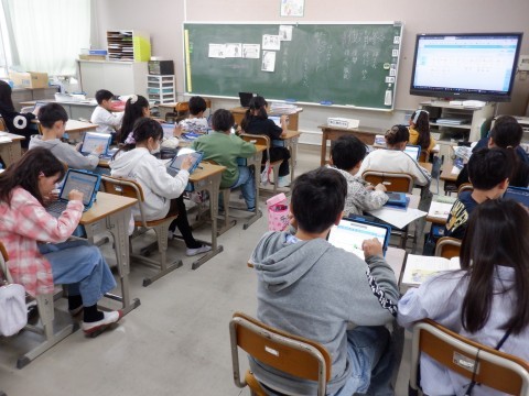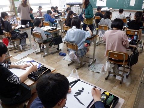 国語、書写、国語の授業です。国語は、作品の展開をタブレットを使って確認しています。登場人物や出来事などを図にして、変化があったところを目で見てわかるようにしています。作者の意図が読み取れる手助けになればいいですね。