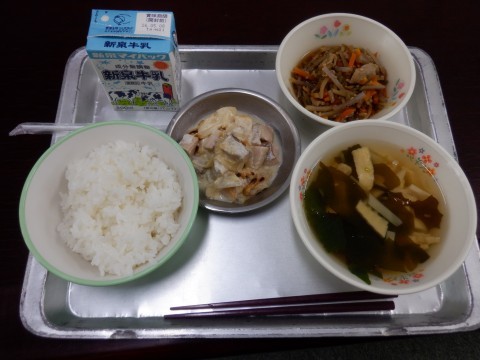 鮭のマヨみそ焼き、きんぴらごぼう、若竹汁、ごはん、牛乳です。きんぴらごぼう、若竹汁は野菜たっぷりで健康的でした。